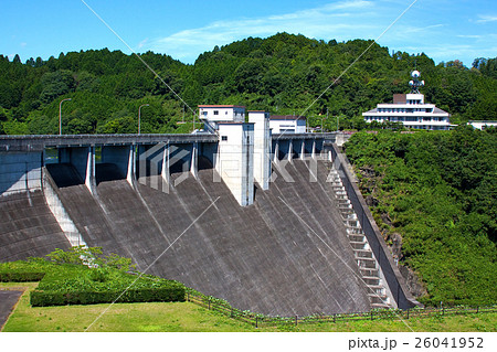 布目ダム全景と水資源開発機構 ダム下の公園から見た青空を背景にそそり立つ布目ダム 標準