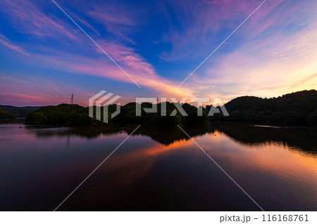 中秋の奈良布目ダム布目湖上空の夕焼け空 青いグラデーションの空と湖面
