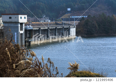 新春の奈良布目ダム寒風吹きすさぶ夕景 ダムを後にして流れ下る布目川