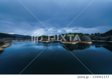 新春奈良布目ダムの夕景 布目湖上空を吹き渡る雲と空を映す湖面㉔