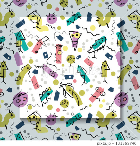 Illustration simple drawing, doodle art kid style. Abstract graphic design, seamless vector pattern with colorful and cute cartoon portrait