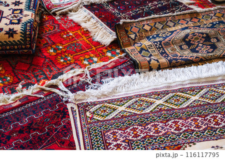 stack of traditional oriental Arab Asian Uzbek handmade colorful carpets at the market in Uzbekistan stack of traditional oriental Arab Asian Uzbek handmade colorful carpets at the market in