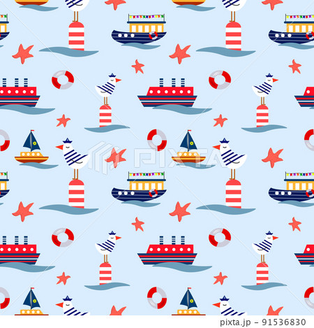 Patter with childrens drawing of ships. Marine illustration with seagull, lifebuoy, starfish and different ships. Vector illustration for scrapbooking, wrapping paper, leaflet and flyer design, prints