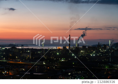 潮見公園から見る室蘭の工場地帯と白鳥大橋の夕景