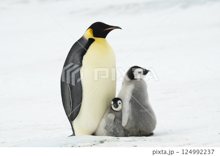 Emperor Penguin with two chicks in Antarctica