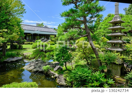 東京都葛飾区柴又7丁目の帝釈天(題経寺)の大回廊から庭園(邃渓園)と大客殿方面を見る