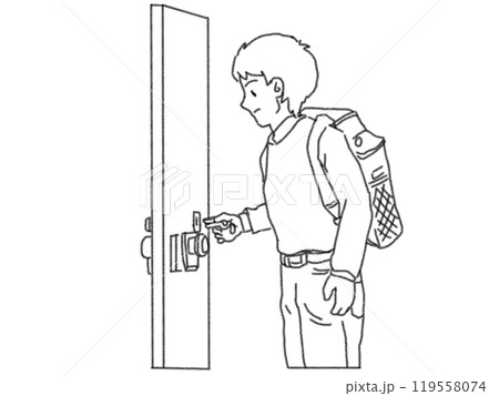 鉛筆画風のドアのカギを閉める人の線画イラスト