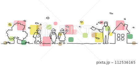 下校中の子どもたちと見守るおじいさんの風景線画イラスト