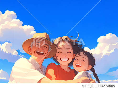 青空の下で微笑む親子三代の家族-1
