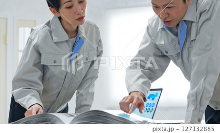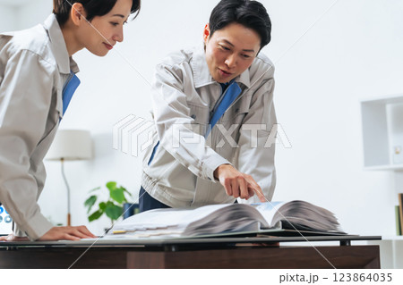 カタログを見ながら打ち合わせする作業員グループ