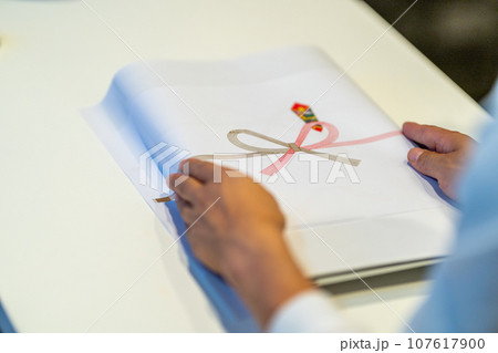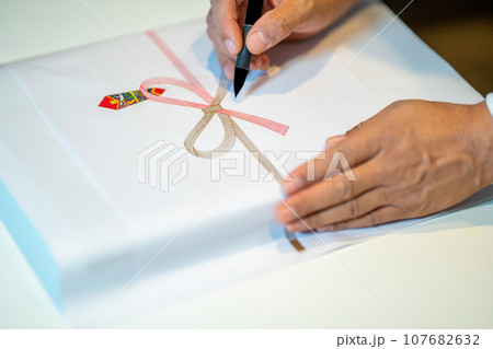 贈答品にのし紙をつけるために準備する人物