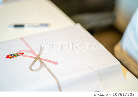 のし紙をつけた品物の上にペンと老眼鏡