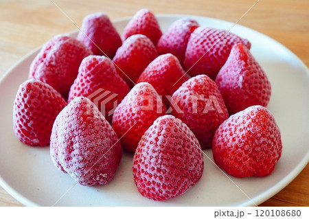 お皿にのせた冷凍いちご。いちご農園の甘くて美味しいいちご。