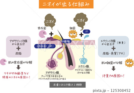 汗腺、毛穴がわかる肌の断面図とニオイの原因が分かりやすく表されたイラスト