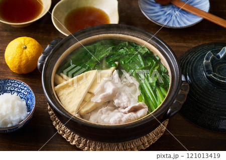 注意)湯気は合成です。冬の常夜鍋、鍋物、ホウレン草、豚肉、油あげ、椎茸。レモンを添えて。