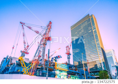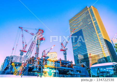 日本の東京都市景観新風景 大手町プレイスや巨大鉄骨構造体、電車、東京駅前のビル群などを望む…新時代へ