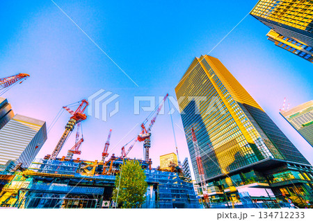 日本の東京都市景観新風景。変貌する大手町。巨大クレーン林立!。常盤橋再開発 TOKYO TORCH…