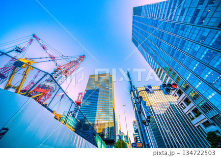 日本の東京都市景観新風景 大手町プレイスや巨大鉄骨構造体、電車、東京駅前のビル群…明日へ