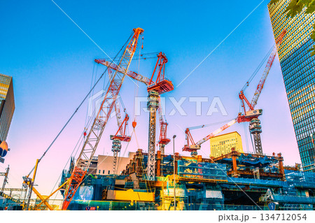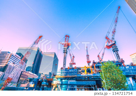 日本の東京都市景観新風景。TOKYO TORCH 大手町に巨大鉄骨構造体やクレーン群。常盤橋再開発