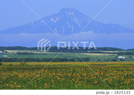 黄色い花が咲く湿原と霞む山 利尻富士