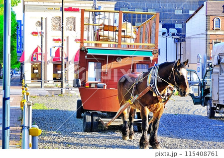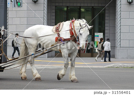 札幌市中心部を歩く馬車の白い馬 札幌観光