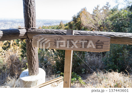神奈川県湯河原町・ 満開の梅の花と案内看板が立つ春の観光地、幕山公園の梅林入口風景