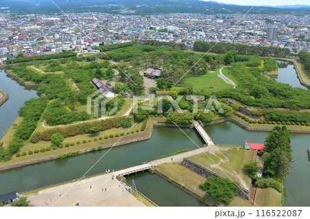 View of the star shaped Goryokaku fort from the Goryokaku tower in Hakodate city in Hokkaido Japan