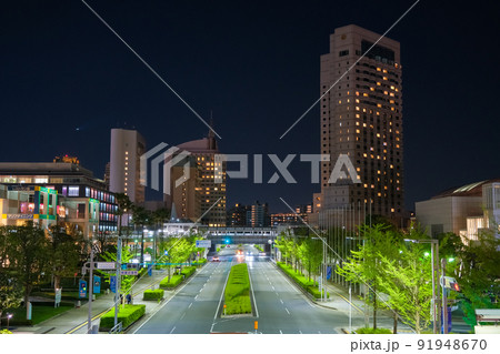 千葉市美浜区 夜の幕張新都心、メッセ大通りと高層ビル群