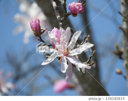 Blooming magnolia stellata tree branches against blue sky