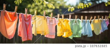 Children's clothing dries on a clothesline in the backyard outside in the sunlight after being washed. Rope with clean clothes on laundry day