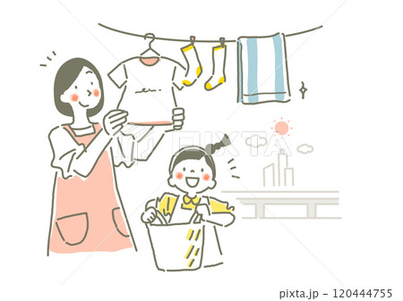一緒に洗濯物を干すお母さんと女の子 お洒落でかわいい手描きイラスト