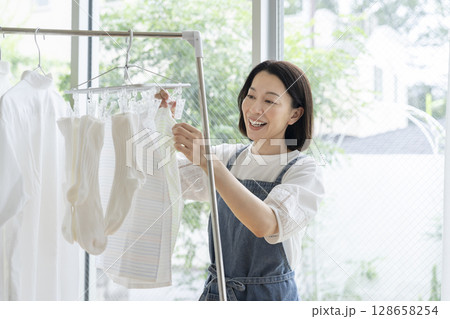 【洗濯物を干すミドル主婦の家事のシーン マスク サーキュレーター有】