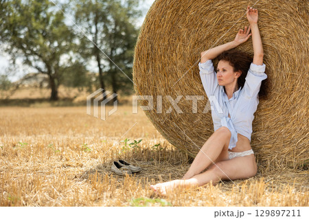 Hot summer day - half naked sexy woman posing in field next to hay bales