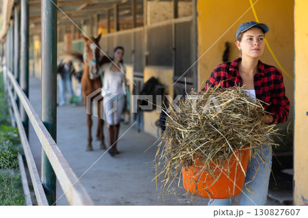 Young woman with hay in bucket