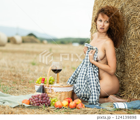 Naked woman in light cape poses on picnic near hay bales in summer field