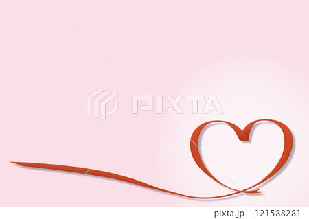 長い赤のリボンがハートの形になって置かれた薄いピンクの背景