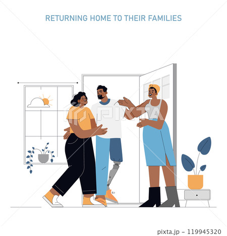 Family reunion moment with joyous greetings at the doorway, expressing loving homecoming emotions. Flat style vector illustration.