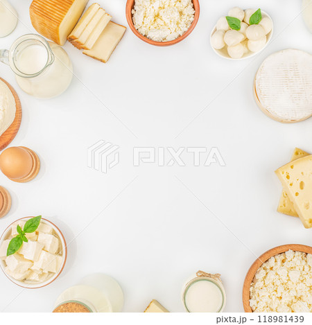 Set of different dairy products milk, sour cream, cottage cheese on a white background top view. copy space, yogurt and butter, eco lactose-free food