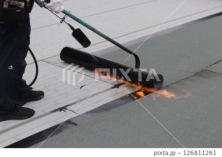 トーチバーナーで炙りながらある施工するアスファルト防水