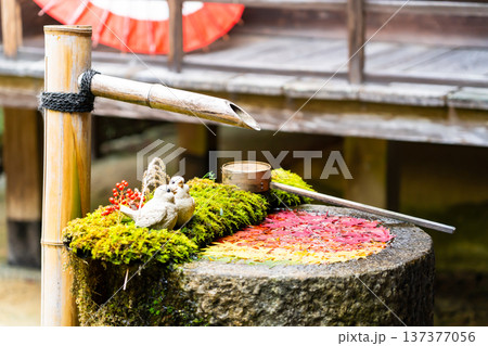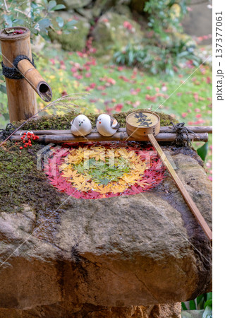 京都府長岡京市 西山 楊谷寺 (柳谷観音) 境内の花手水 紅白ともみじ紅葉