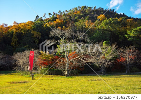 東屋から見える庭園 秋の昼間の紫式部公園 11月 紅葉