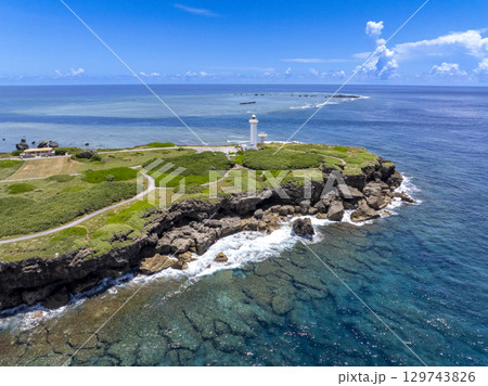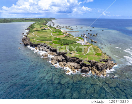 宮古島の有名観光地で南国バカンス・東平安名埼の平安名埼灯台と美しいサンゴ礁と青い海(沖縄県宮古島市)