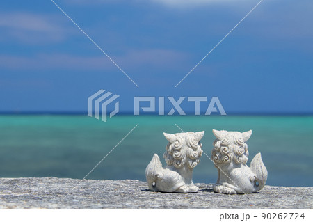 沖縄の青い海とシーサー