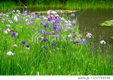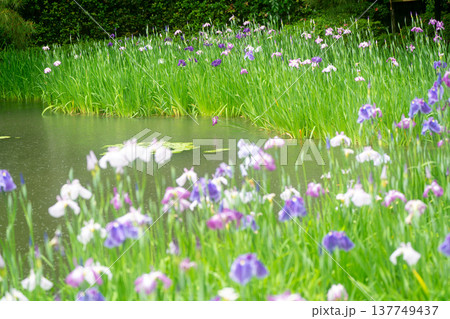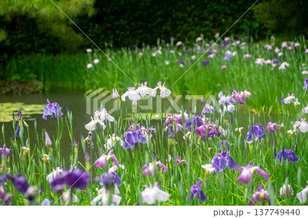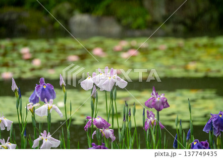京都市左京区岡崎の平安神宮西神苑白虎池で咲き誇る雨の中の花菖蒲