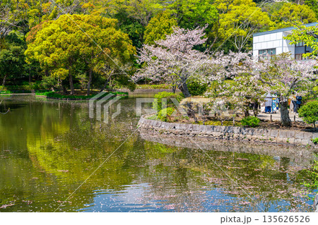 鎌倉市 鎌倉文華館鶴岡ミュージアム前の平家池散策路と満開の桜