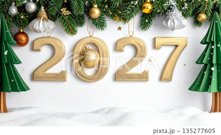 Celebrate the winter holiday season with a festive Christmas and New Year card featuring a decorated green fir tree branch adorned with gold bauble ornaments and gift boxes for a creative design 2027