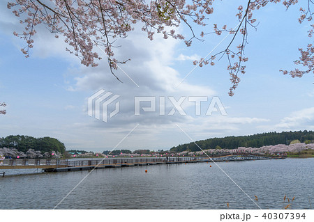 宮城平筒沼ふれあい公園の浮橋と満開の桜