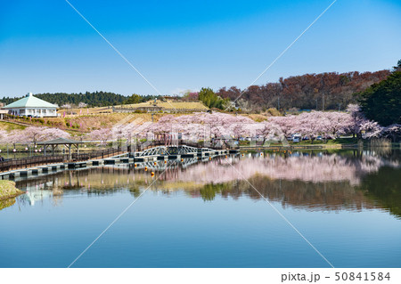 宮城平筒沼ふれあい公園の橋と満開の桜