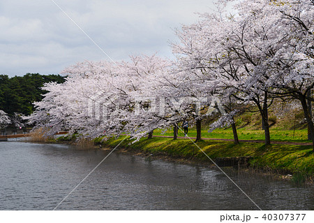 宮城平筒沼の満開の桜並木とヘラブナ釣り