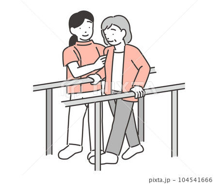 歩行訓練をする、シニア女性とそれを介助する指導員のベクターイラスト素材/リハビリ